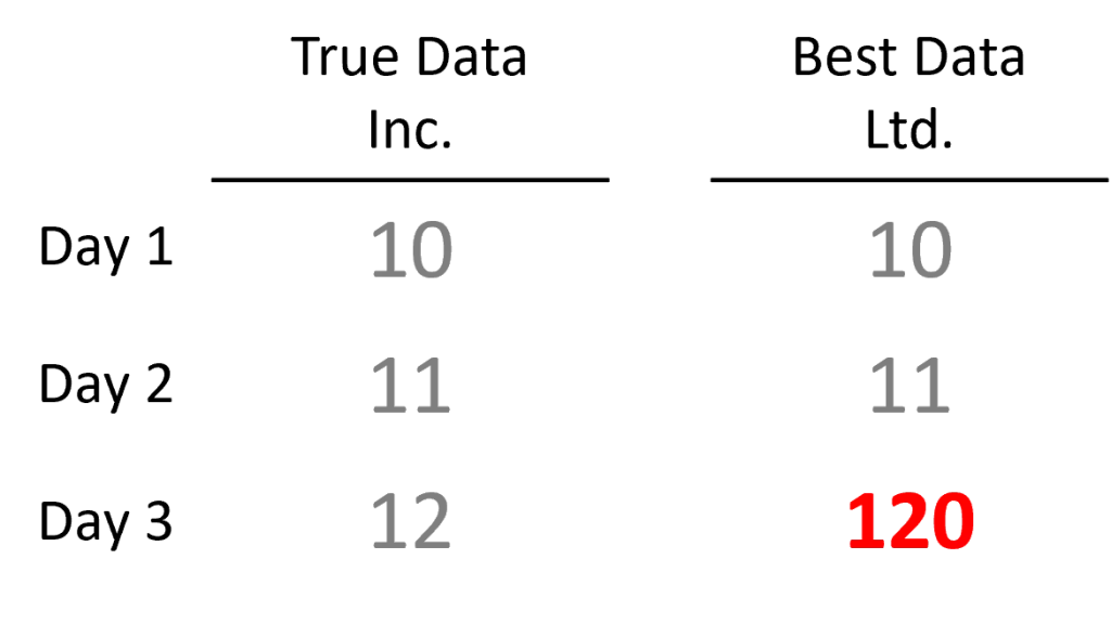 When a hedge fund considers whose data to buy, they run a backtest on each vendor’s historical data. The backtests look great (of course). But in the case of Best Data Ltd, the backtest would look much worse if the day 3 typo was in the historical data.