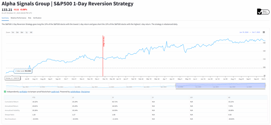 Publishing a strategy as a live index means your QuantConnect algorithm’s live portfolio weights are continuously calculated by validityBase as the official calculation agent. Each rebalance and performance update is independently verified and anchored to a blockchain-backed audit trail.